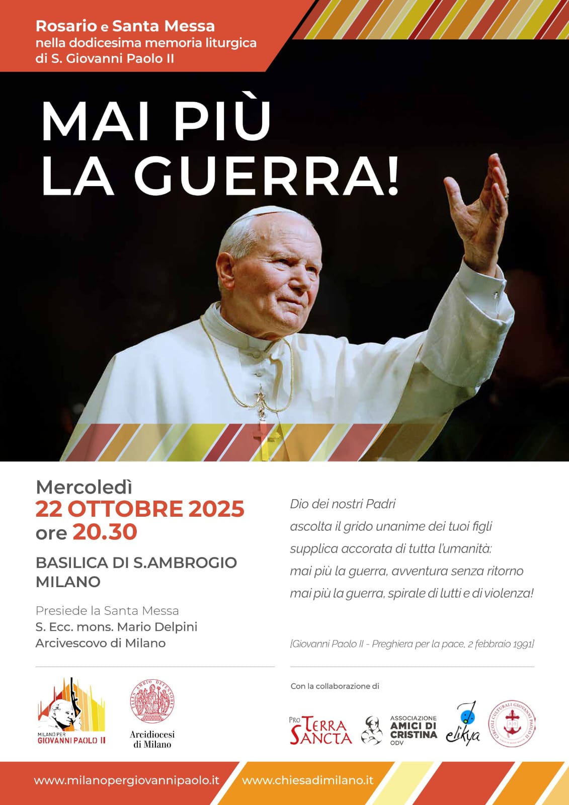 Mercoledì 22 ottobre alle ore 20.30, in occasione della dodicesima memoria liturgica di S. Giovanni Paolo II, si svolgeranno presso la Basilica di Sant'Ambrogio il rosario e la Santa Messa.